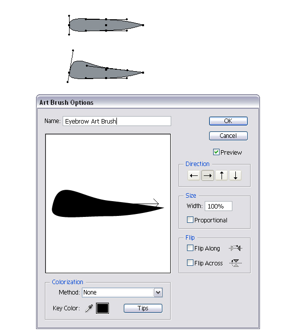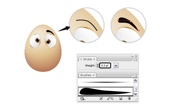 ابزار قلم Pen Tool (P) یا ابزار مداد Pencil Tool (N) را بگیرید و یک مسیر بالای چشم راست همانند شکل زیر بکشید. این مسیر را با Eyebrow Art Brush رنگ آمیزی نمایید سپس Stroke Weightرا 0.3 pt. قرار دهید.