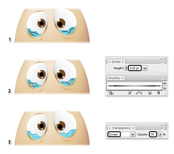 ابزار قلم یا مداد را بگیرید و یک مسیر موج گون زیر هر چشم بکشید (1) سپس شما به شکل سفید چشم ها نیاز دارید. مسیر موج گون و کپی شکل سفید برای چشم راست را انتخاب کنید و در پنل Pathfinder گزینه Divide را فشار دهید. (2). Ungroup (Shift-Control-G) را انتخاب کنید سپس شکل های بالا را پاک کنید (3) جیزهای مشابه را برای چشم چپ تکرار کنید.