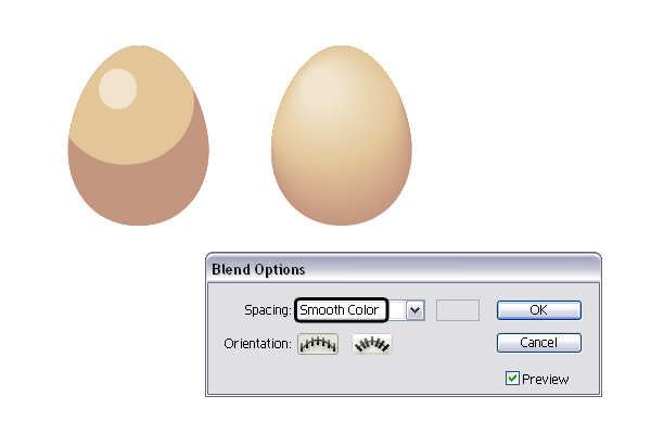 قبل از آنکه ادامه دهید، شکل تخم مرغ را انتخاب کنید و تعدادی کپی از آن ایجاد نمایید زیرا بعدتر به آن نیاز پیدا خواهید کرد. حالا سه شکل را انتخاب کنید و به مسیر Object > Blend > Blend Options, بروید، Smooth Color را انتخاب نمایید و اوکی نمایید. به مسیر Object > Blend > Make (Alt-Control-B)بازگردید حالا شما یک بردار تخم مرغ به دست آورده اید.