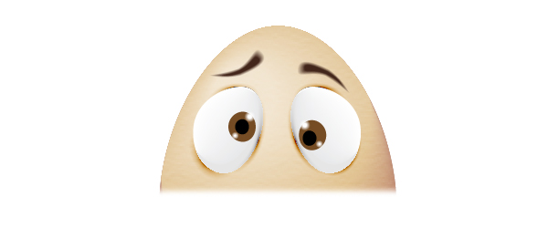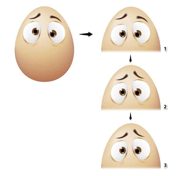 یک کپی دیگر از اولین کاراکتر تخم مرغ بگیرید و تخم چشم، مردمک و برق چشم را حذف کنید. قسمت باقیمانده از چشم راست را بگیرید و آن را مقدار کمی کوچک تر نمایید سپس چشم ها را به هم نزدیک تر کنید (1) سپس موقعیت ابروها را تغییر دهید (2) و موقعیت چین و چروک های زیر چشم ها را نیز تغییر دهید.