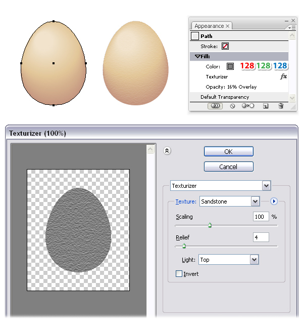 یک کپی از شکل تخم مرغ بگیرید و آن را در جلوی همه چیز بیاورید با رفتن به مسیر Object > Arrange > Bring to Front (Shift-Control-]).. خاکستری را به عنوان رنگ پر انتخاب کنید سپس به مسیر toEffect> Texture > Texturizer بروید و تنظیماتی را که در زیر نشان داده شده است اعمال نمایید. به این شکل یک Blending Mode Overlay اعمال نمایید با Opacity 16 درصد.