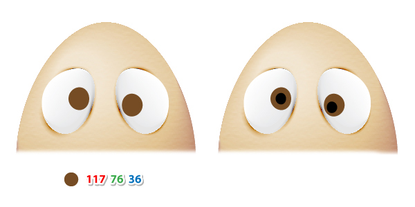 ابزار بیضی را بگیرید و دو شکل به عنوان تخم چشم بکشید و آنها را قهوه ای کنید. آنها دایره های کامل نیستند بنابراین از ابزار Direct Selection Tool (A)برای مقدار کمی شکسته کردن استفاده کنید. سپس، دو شکل کوچک تر به عنوان مردمک چشم بکشید و آنها را مشکی نمایید.