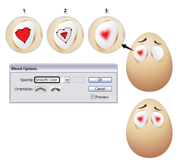 با استفاده از ابزار قلم یک شکل قلب درون چشم چپ بکشید و آن نباید کامل باشد (1) یک کپی کوچک تر از قلب در مرکز بسازید. هر دو شکل را با قرمز پر کنید اما مقدار Opacity قلب بزرگتر را 10 درصد قرار دهید (2) با داشتن همه آنها انتخاب شده به مسیر Object > Blend > Blend Options بروید و Smooth Color را انتخاب کنید و اوکی نمایید. به مسیر Object > Blend > Make (Alt-Control-B) بازگردید و نتیجه باید شبیه به شکل زیر باشد. (3)