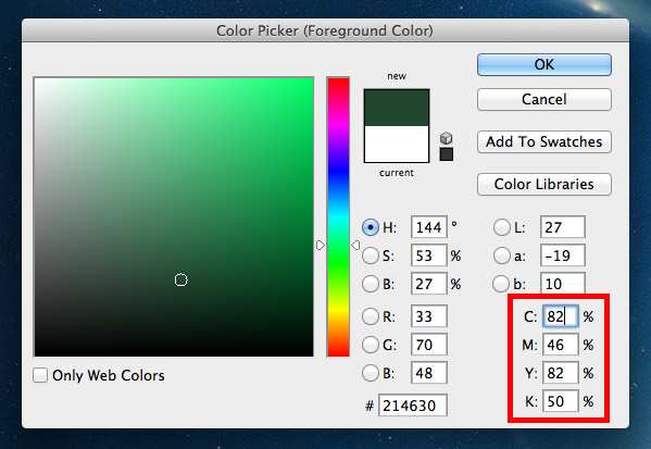 فتوشاپ را باز کرده و کلید D را برای ریست کردن رنگهای پس زمینه و پیش زمینه روی مقادیر پیش فرض فشار دهید. مشکیای را که برای شما مناسب است انتخاب کنید. حالا به مقادیر CMYK که رنگها از روی آن ساخته میشوند توجه کنید. این مقادیر عبارتند از %75 C، %68 M، %67 Y و %90 K (مجموع پوشش نهایی:300 درصد). این مقدار، جوهر زیادی را روی کاغذ میریزد. بهتر است مقدار مناسبی را برای رنگ مشکی به صورت دستی تنظیم کنید. این مقادیر میتوانند 100و0و0و0 باشند که مشکی مناسبی را برای متن فراهم میآورد. هر چند این مقادیر چنانچه به عنوان رنگ پس زمینه بکار روند بیشتر خاکستری تیره به نظر می آیند تا مشکی. در همه این موارد میتوانید انتخاب یک رنگ مشکی زیبا را از بین پیشنهادهای متعدد برای این مقادیر انجام دهید. اما مقادیر 100و40و40و50 انتخابهای معمول از بین این مقادیر هستند. اضافه کردن مقدار سایر رنگها باعث تاریک شدن رنگ مشکی و ایجاد رنگهای عمیقتر میشود. به همین دلیل بهترین انتخاب، مقادیر درون محدوده پوشش میباشد.