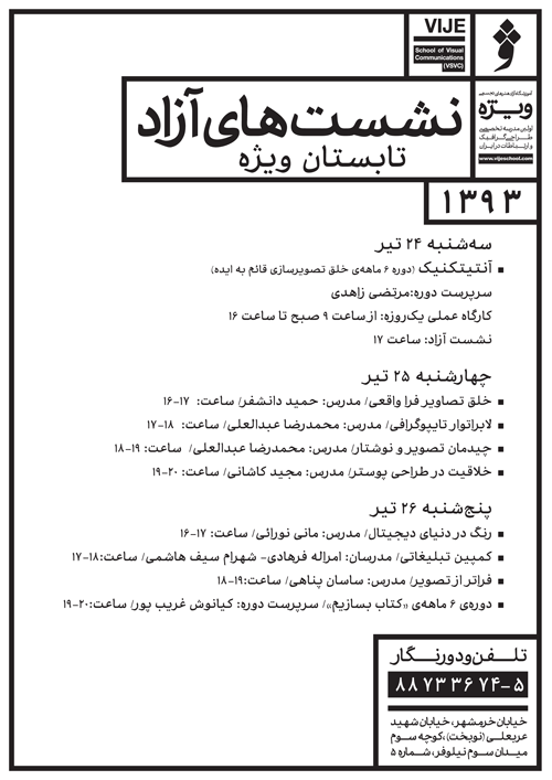 - چیدمان تصویر و نوشتار / مدرس: محمدرضا عبدالعلی / ساعت: 19 - 18