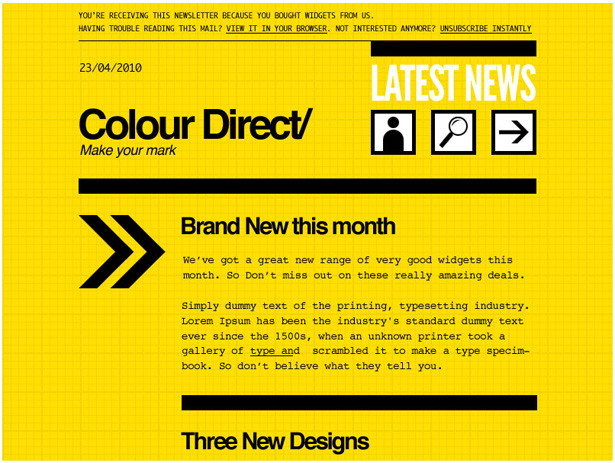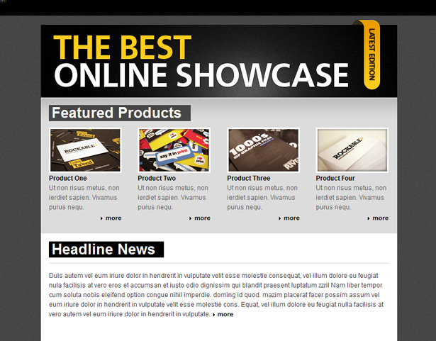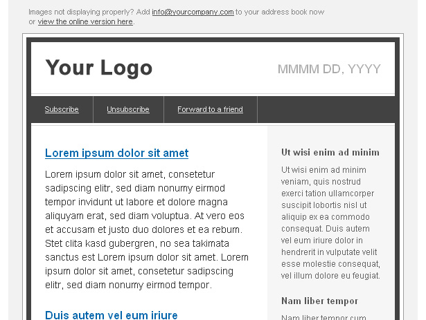 قالبهای اولیه بسیاری برای طراحی ایمیلها در دسترس هستند که کارایی آنها مورد آزمون قرار گرفته و اثبات شده است. یکی از این قالبها را متناسب با اشل رنگی مشابه با وب سایت خود، پیدا کرده، به سرعت لوگوی خود را در آن قرار داده و برای ادامه کار آماده شوید.