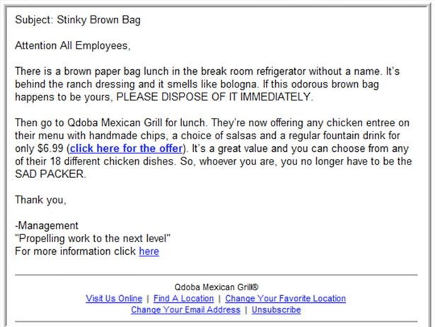 در این کار، طراحی بسیار موفق و درخشانی را میبینید. در آغاز با یک ایمیل درون شرکتی ملایم روبرو میشوید و سپس با یک پیام تهاجمی و انفعالی مواجه خواهید شد. مطئن باشید که دریافت کنندگان آن را خواهند خواند.