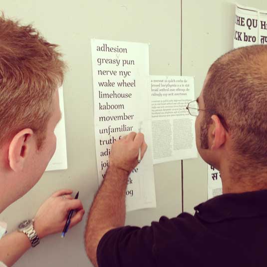 یک سند InDesign با قالب متنی بسازید و این کلمات را در آن کپی کنید. من هر یک از این قالبهای متنی را به منظور مقایسه با اندازه فونتهای مختلف (این اندازهها به نوع استفاده از طرححرف شما بستگی دارد) ذخیره کردهام. در نهایت طرححرف خود را بیرون برده و به منظور مشاهده آن در کار، در سند مربوطه آن را انتخاب کنید.