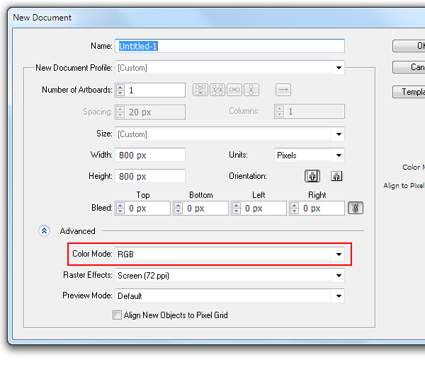 برای شروع یک صفحه جدید ایجاد کنید. (File > New…). ابعاد صفحه مهم نیست چرا که ما یک وکتور المان ایجاد خواهیم کرد که شما می توانید در صفحه های مختلف از آن استفاده کنید. بر روی گزینه Advanced کلیک نمایید و حالت رنگ را RGB نمایید. البته اگر از ابتدا به طور پیش فرض انتخاب نشده بود.